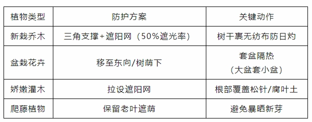 新栽苗木:搭遮阴网+早晚喷雾补水